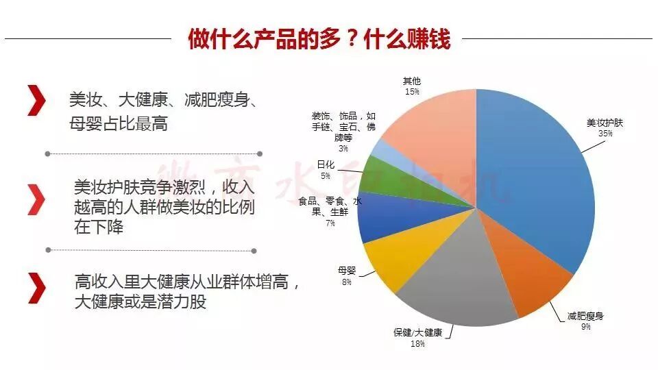 微商产品主要集中在美妆、大健康、减肥瘦身、母婴、日化类,其他类别里还有很多做医美、微整形的。