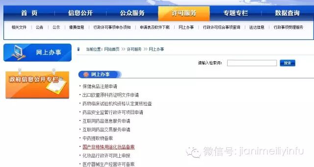 第二步:点击导航栏“许可服务”,点击子类目“网上办事”,再点击国产非特殊用途化妆品备案