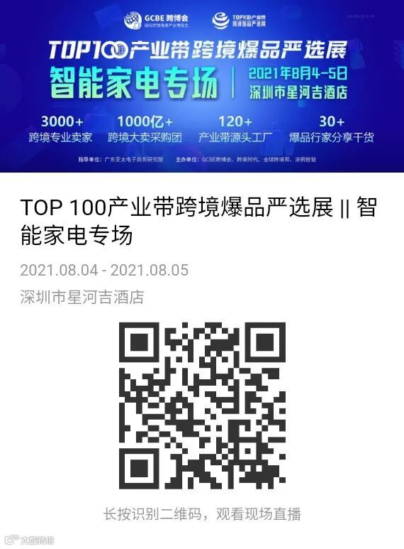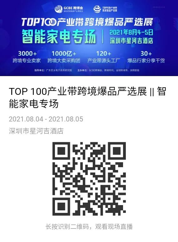 2021年8月4-5日,由广东亚太电子商务研究院指导,GCBE跨博会、跨境时代、全球跨境帮、涂鸦智能联合主办,以“飓品出海 爆卖全球”为主题的TOP100产业带跨境爆品严选展——智能家电专场(以下简称“严选展”)在深圳星河吉酒店成功举办。