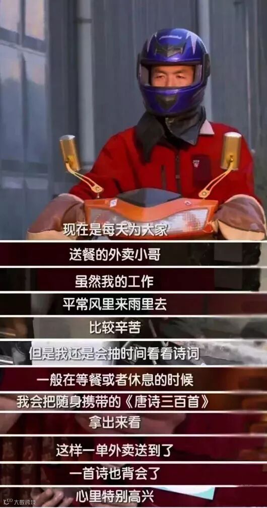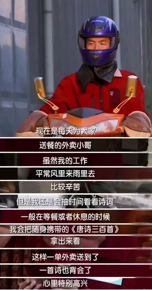 这位外卖小哥过五关斩六将,最终击败北大文学硕士取得冠军。自此,也让雷海为成为了外卖小哥里最会背诗的“网红”,被人戏称为中国最神秘的组织,外卖小哥组织,再次刷爆人的眼球。你永远都不知道你的外卖小哥除了送外卖还有什么才艺。