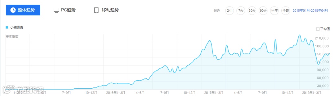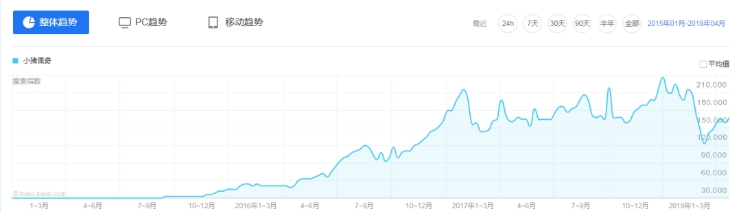 自2015年上线以来,“小猪佩奇”的百度指数便持续上升,从2017年起到现在一直居高不下。
