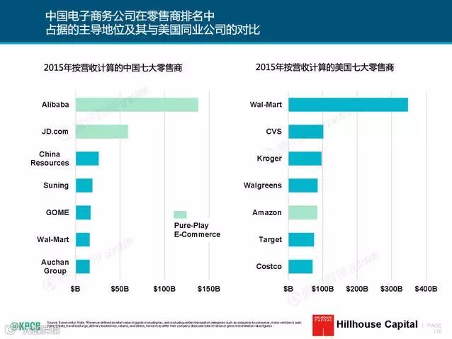 2015年按营收计算的中国七大零售商中,排名前两位的阿里巴巴和京东均是纯电子商务企业。排在第四和四五的苏宁和国美也从2010年左右开始发力线上,如今与阿里联姻后的苏宁也完全打通了线上线下渠道。
