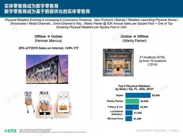 比如Neiman Marcus这家1900年诞生的百货公司现在已有25%的线上销售占比,而出身线上的Warby Parker也已经开出了自己的实体店,且表现不错,在实体店零售业中排名第二。