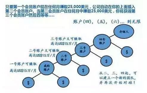 “WV梦幻之旅”奖金制度属于延迟发放奖金的模式,只有推荐了6个新会员,左三右三为一个大对碰,老会员才开始拿奖金。这一方面意味着会制造大量的业绩沉淀,一方面迫使会员继续疯狂地拉人头进来。这样做的目的是:1、大量的圈钱;2、避免实际去旅游的人多了,无法支付费用;3、维持运转延迟崩盘时间。
