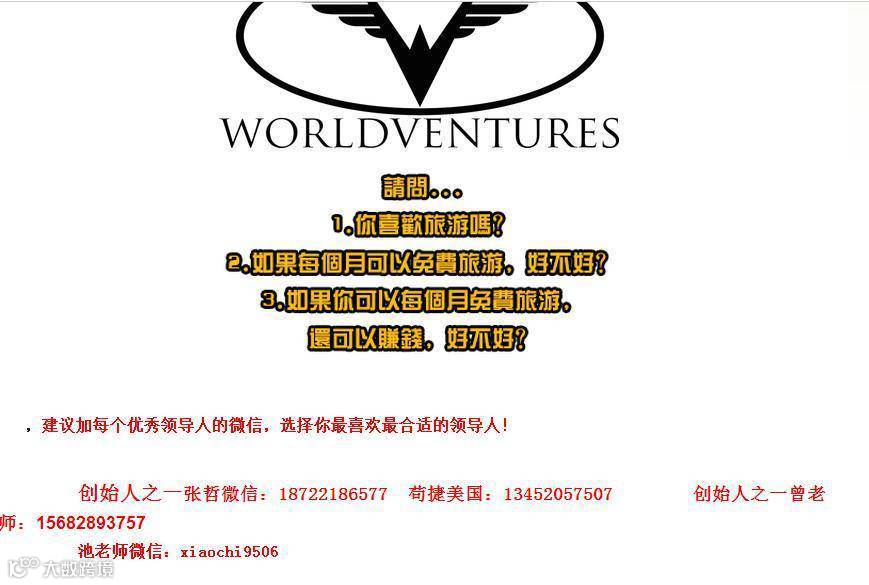近日,记者的朋友圈出现一则《旅游传销大揭秘——WV梦幻之旅的“庞氏骗局”》的新闻,文章中指出,WV梦幻之旅打着边旅游边赚钱的幌子吸纳会员从而进行诈骗,为此,北京时间记者从WV梦幻之旅中文官方网站中找到了所谓创始人之一的张先生,并加了微信号表示想要加入WV这个大家庭。