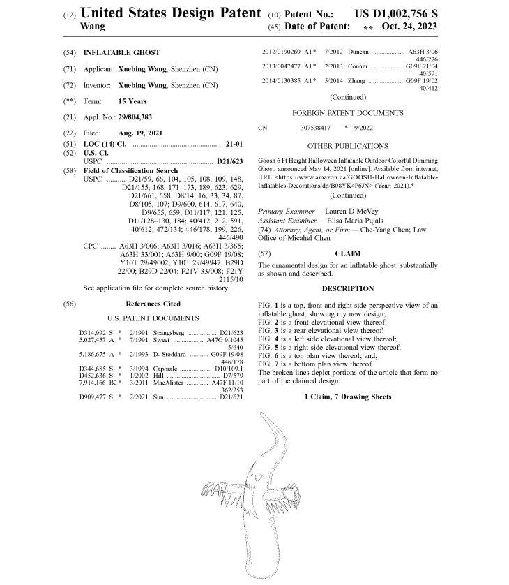卖家提醒:充气装饰(尤其是节日充气幽灵)在造型、注气口位置、固定装置与面料拼接处上可能被专利覆盖。若工厂提供的充气幽灵与专利产品有明显相似度,建议立即停单并要求改款或寻找无侵权风险的替代款式。