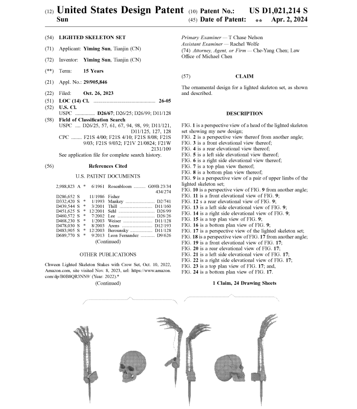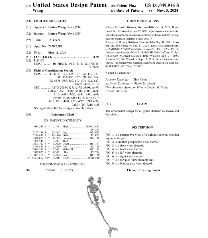 卖家提醒:已下证的发光骨架套装在灯位布局、骨骼造型或整体组合方式上可能受保护;若售卖带灯的骷髅道具,需重点比对灯位与结构设计,避免使用与专利近似的装配方案或宣传图。
