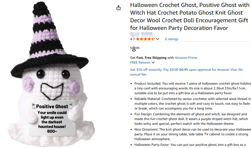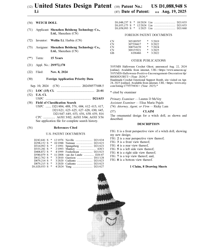 卖家提醒:针织玩偶类的外观专利保护通常会覆盖整体轮廓、面部表情比例及服饰样式。卖家若销售类似“幽灵/女巫”造型玩具,务必核查产品造型细节并避免使用专利保护的造型元素或官方图片。