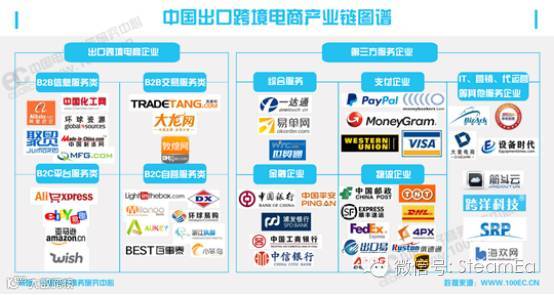 同时,报告还首度发布了“中国出口跨境电商产业链图谱”,图谱对出口跨境电商企业进行分类,如B2B信息服务类包括:阿里巴巴国际站、中国化工网英文版、环球资源、中国制造网、MFG.com、聚贸等。B2B交易服务类包括:易唐网、大龙网、敦煌网等。B2C平台服务类包括:全球速卖通、eBay、亚马逊、Wish等,B2C自营服务类包括:兰亭集势、DX、米兰网、环球易购、百事泰、傲基国际、执御、小笨鸟等。还包括像一达通、易单网、四海商周等第三方服务企业。
