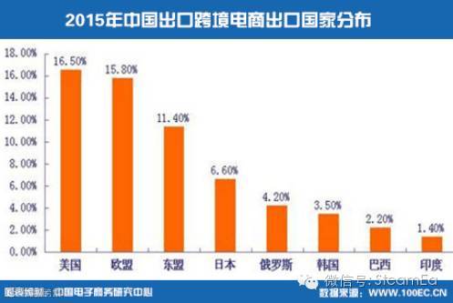 据中国电子商务研究中心(100EC.CN)监测数据显示,2015年,中国出口跨境电商的主要目的国,美国(16.5%)、欧盟(15.8%)、东盟(11.4%)、日本(6.6%)、俄罗斯(4.2%)、韩国(3.5%)、巴西(2.2%)、印度(1.4%)、其他38.4%。