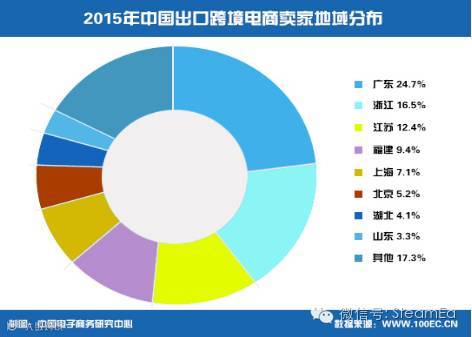 卖家地域分布:2015年,中国出口跨境电商卖家主要集中:广东24.7%、浙江16.5%、江苏12.4%、福建9.4%、上海7.1%、北京5.2%、湖北4.1%、山东3.3%、其他:17.3%。