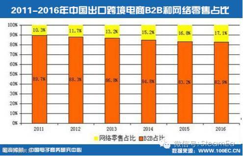 据中国电子商务研究中心(100EC.CN)监测数据显示,2015年,中国出口跨境电商B2B与网上零售占比情况为B2B占83.2%,网上零售占16.8%。