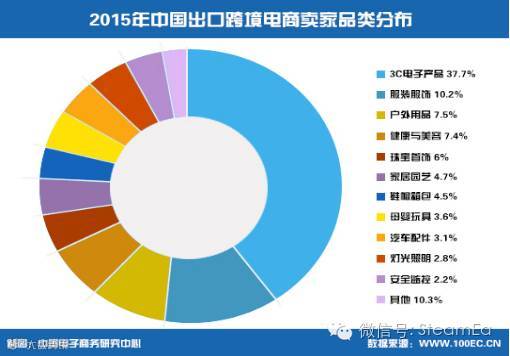 据中国电子商务研究中心(100EC.CN)监测数据显示,2015年,中国出口跨境电商卖家品类主要分布在:3C电子产品(37.7%)、服装服饰(10.2%)、户外用品(7.5%)、健康与美容(7.4%)、珠宝首饰(6%)、家居园艺(4.7%),鞋帽箱包(4.5%)、母婴玩具(3.6%)、汽车配件(3.1%)、灯光照明(2.8%)、安全监控(2.2%)、其他10.3%。