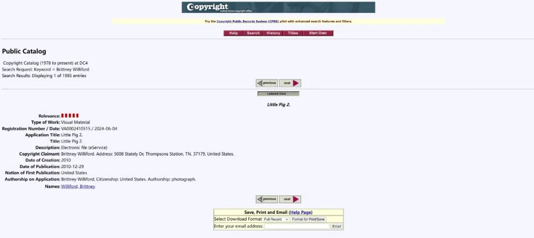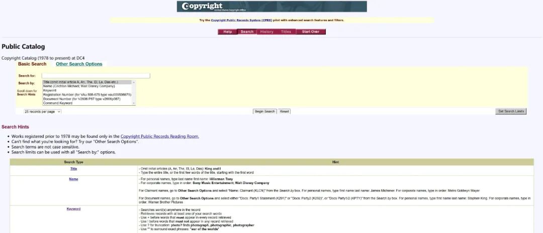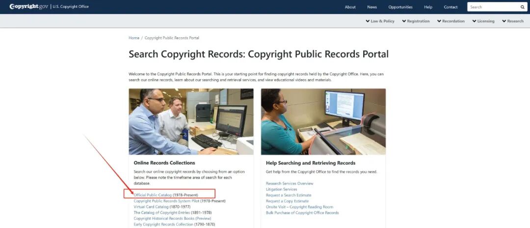 在主页面中,点击 “Official Public Catalog (1978-Present)”,这个目录包含了自1978年以来所有注册的版权信息,非常适合我们查找相关作品的版权归属。