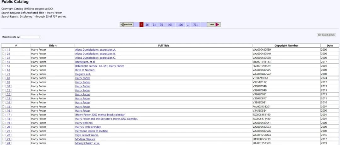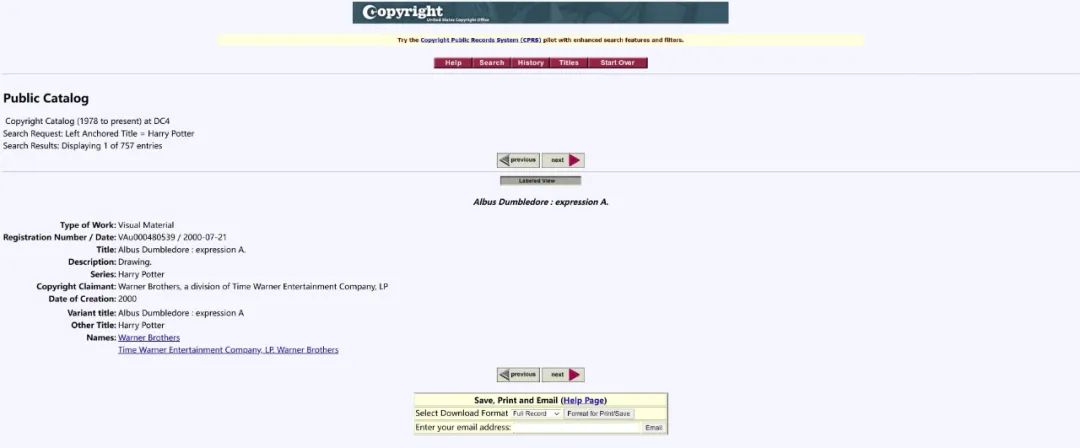 2.系统将列出与“Harry Potter”相关的所有版权记录,包括注册号、注册时间等信息。