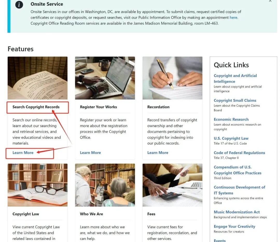 进入页面后,下滑找到 “Search Copyright Records”,点击 “Learn More” 进入版权查询主页面。