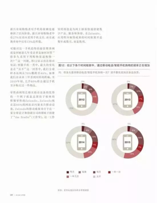 移动设备时来运转成为购买工具 - 回顾前几年受访者是如何回答“你多久采用下列购物渠道购物一次?”,结果显示在移动电话/智能手机一类中,最大的变化是在“从不”这一回答中,我们全球样本比例从70%骤跌至46% 。
