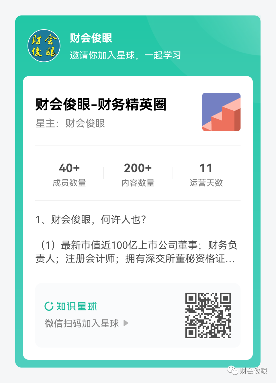 欢迎各位扫描下方二维码。进财务精英圈,我会在星球里实时分享CFO的工作经验、所思所想;给星友指导,布置作业、打卡,帮助星友思考、成长。