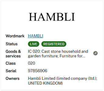 注册商标:HAMBLI(注册于第20类,涵盖家居及家具产品)