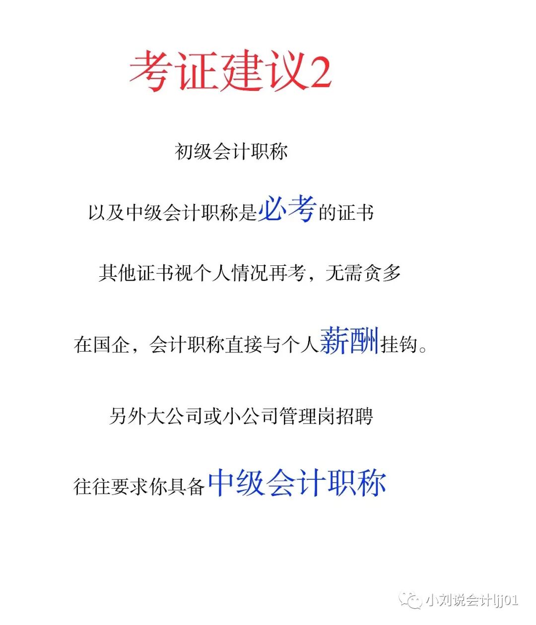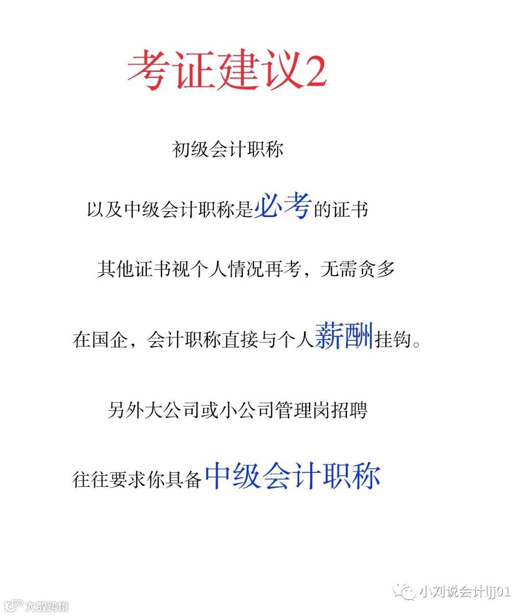 2、初级会计职称和中级会计职称是必考的证书。其他证书视个人情况再考,无需贪多。在国企或大型私企,会计职称直接与个人薪酬挂钩。另外大公司或小公司管理岗招聘时,往往要求具备中级会计职称。
