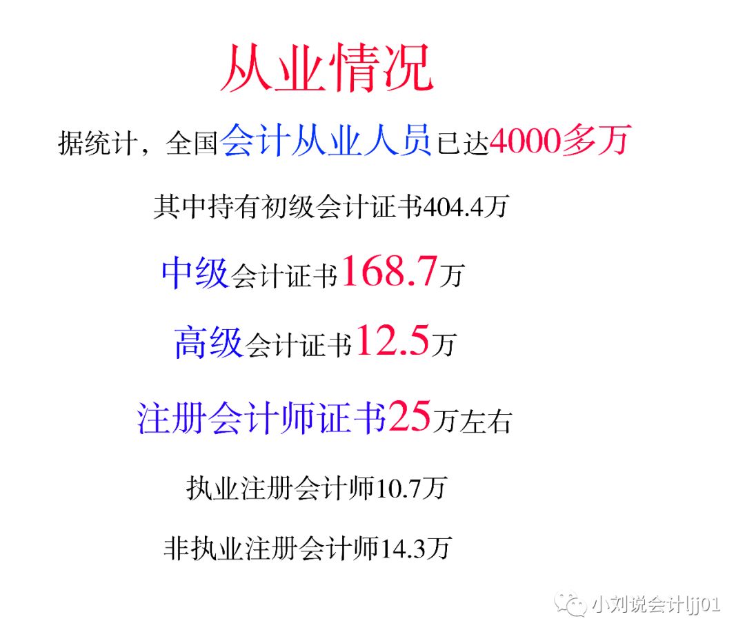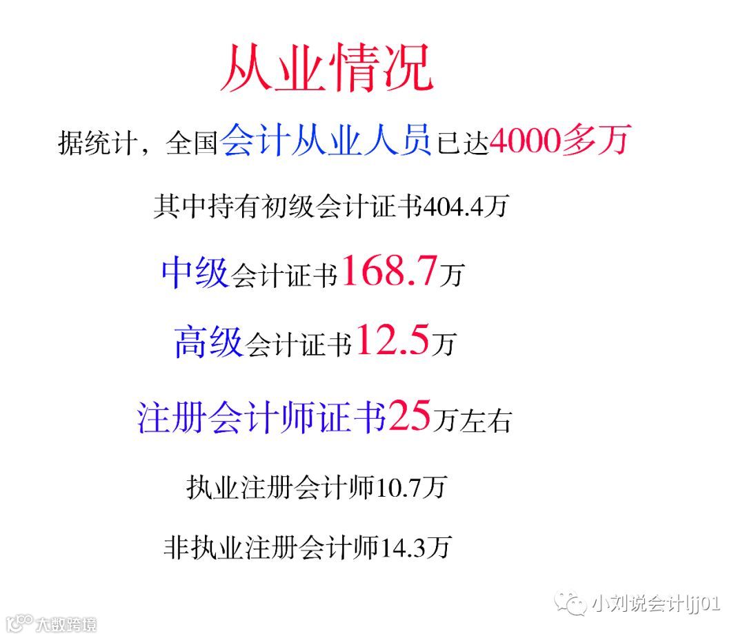 据了解,全国会计从业人员已达4000多万,有证的大约2000万左右,其中持有初级会计证书404.4万、中级会计证书168.7万、高级会计证书12.5万、注册会计师证书25万左右(执业注册会计师10.7万,非执业注册会计师14.3万)。(注:为2018.12.31数据,仅供分析参考)