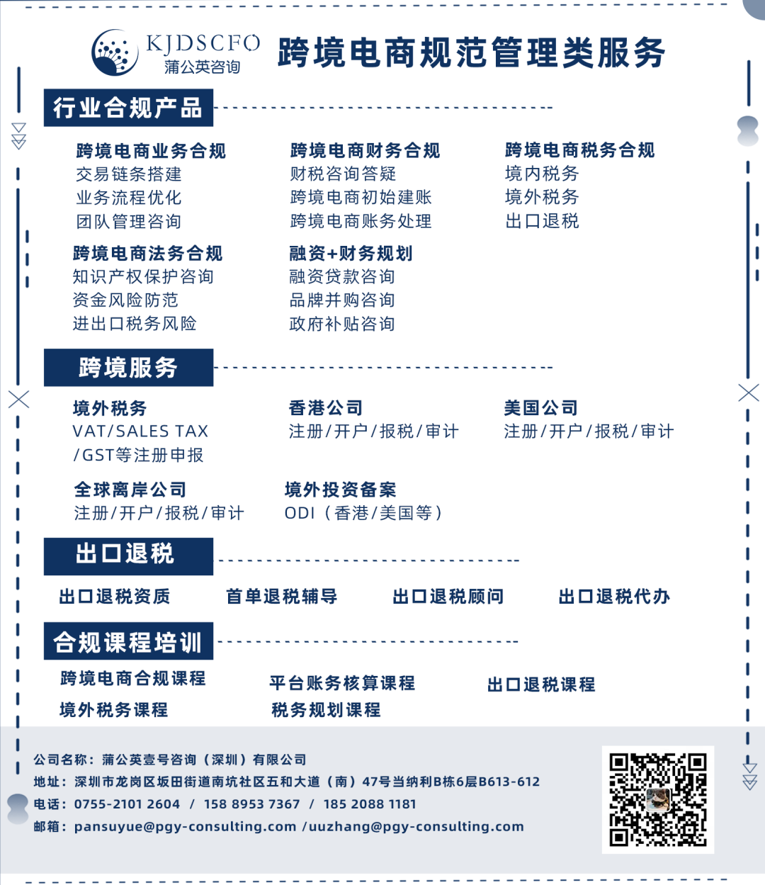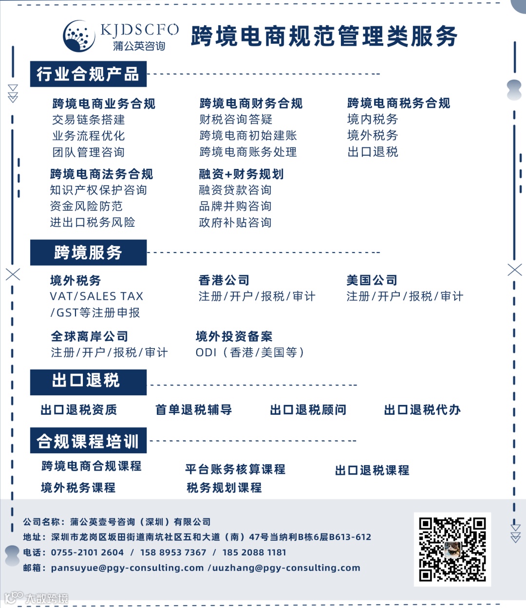 KJDSCFO蒲公英壹号咨询(深圳)有限公司助力跨境电商企业高速、安稳、长远的发展。汇集跨境电商运营/财务/税务总监等行业专家,携手国内外会计师、律师事务所,专注跨境合规服务,包含业财合规、架构设计、培训咨询、出口退税、境内外财税、政府补贴申请等。