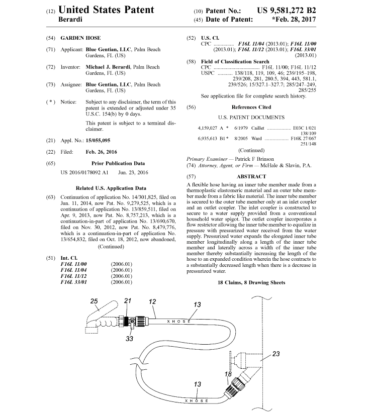 该案涉及发明专利 US9581272B2,保护了一种基于热塑性弹性材料制造的可伸缩水管,其结构设计使其在通水时自动延展,停水后收缩,解决传统水管笨重、打结等问题。