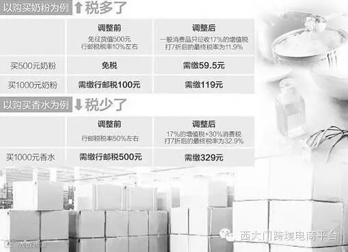 以普通的奶粉为例,此次政策调整前,一次购买500元的奶粉可以免税;政策调整后,需按11.9%的税率缴税,即59.5元。如果一次购买1000元的奶粉,原来按照行邮税需缴税款100元,政策调整后,缴纳增值税为119元。
