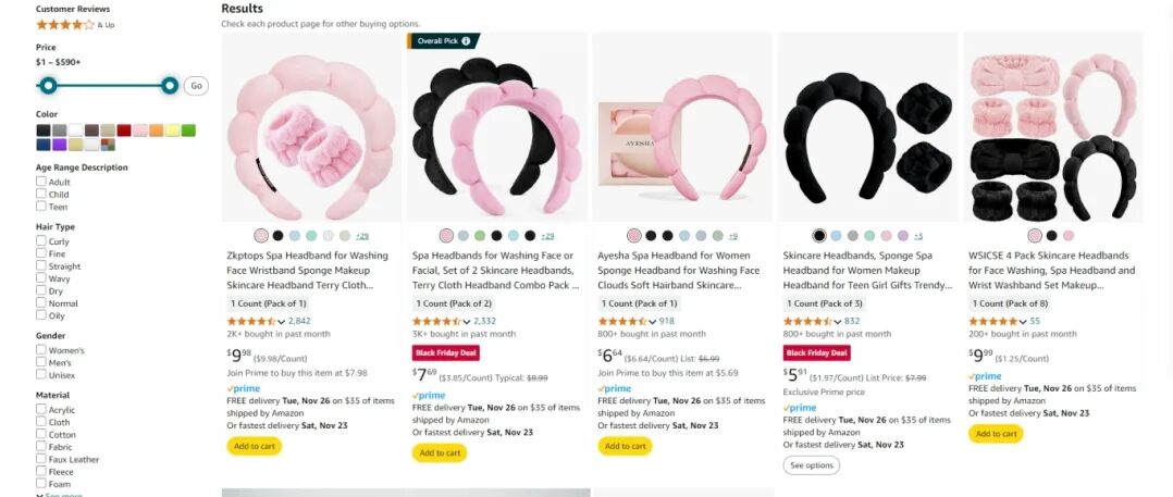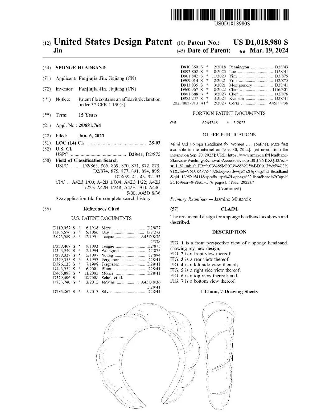 本案涉及的专利为海绵头箍的外观专利,专利号为D1018980。原告为中国卖家Fanjiajia Jin,专利于2024年3月19日获得授权。通过平台搜索可以发现类似的产品,尤其是同款在售的卖家需要特别注意,避免因侵权而面临高额赔偿。