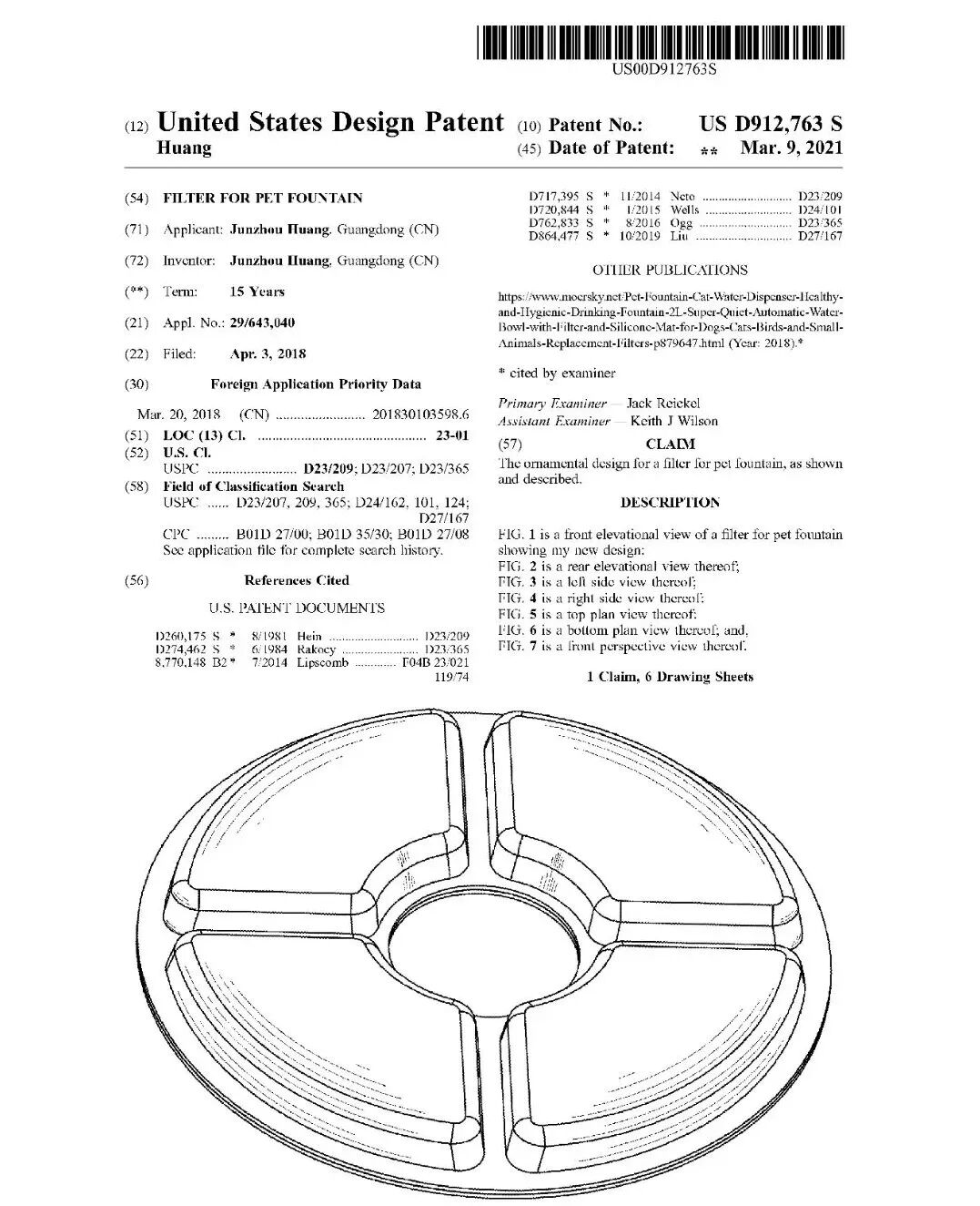 本案涉及一款圆形宠物喷泉过滤器的外观专利,专利号为D912763,原告Junzhou Huang为该专利的所有者,且在全球拥有多项相关专利。