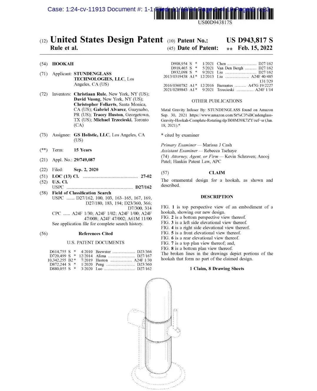本案涉及两项水烟壶的外观专利,专利号分别为D943817和D970804。原告GS Holistic, LLC是一家专注于便携式喷雾器和水烟壶设计的公司,旗下的GS电子烟非常受欢迎。