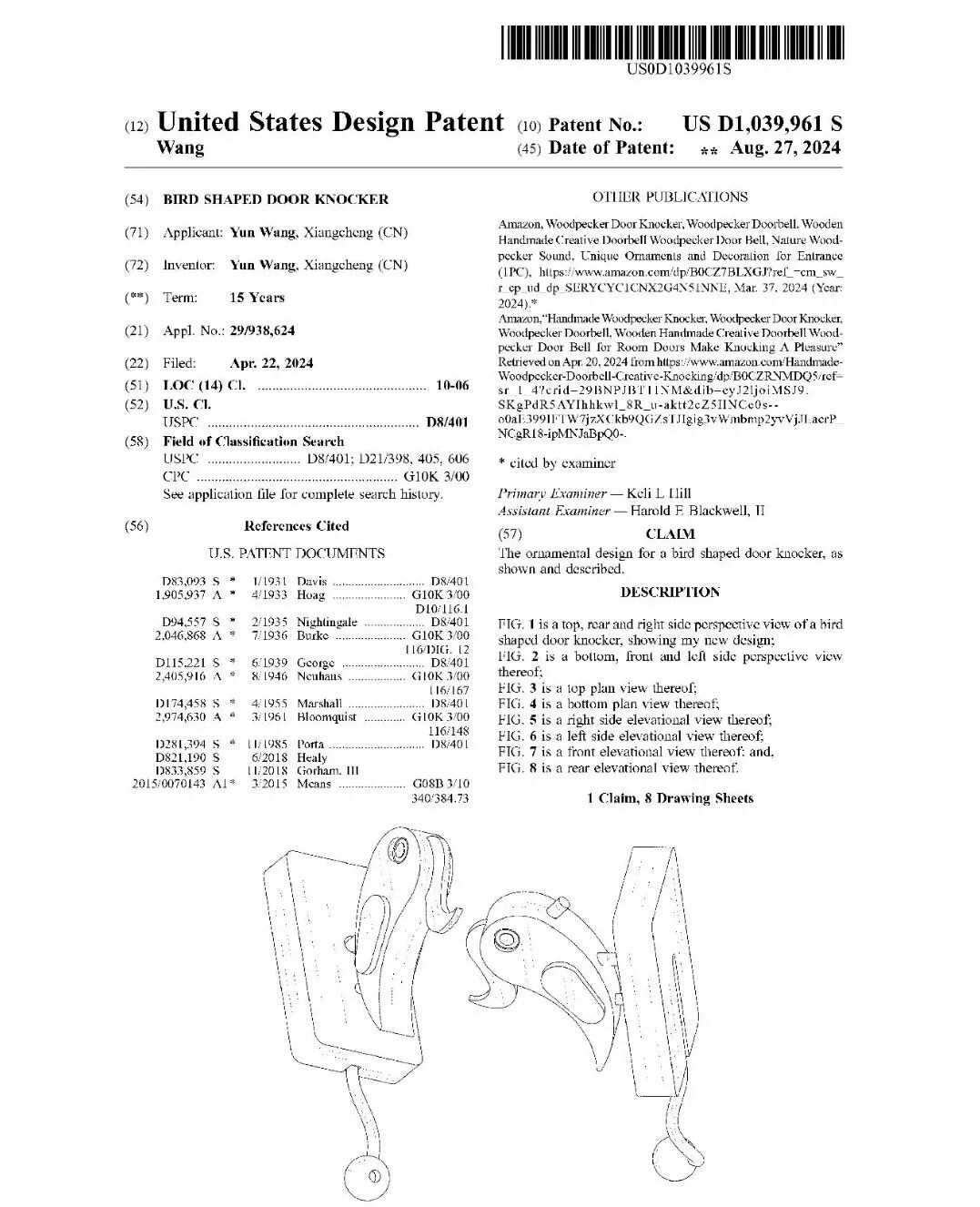 这起案件涉及一款鸟型门环的设计,专利号为D1039961,原告Lucky Wang为该专利的所有者。该门环具有独特的鸟形图案和复古设计,特别适合农舍门使用。