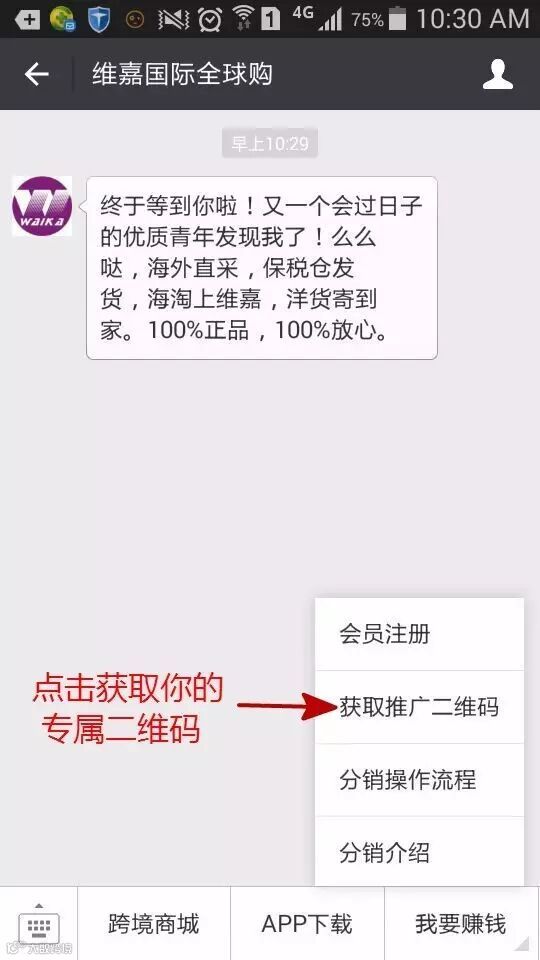 6、还可以点击二级菜单【获取推广二维码】,获取专属于你的二维码,发送给朋友,凡是通过扫描自己的专属二维码关注维嘉服务号的会员,自动成为自己的下级。下级购买产品,你就可以获得佣金。