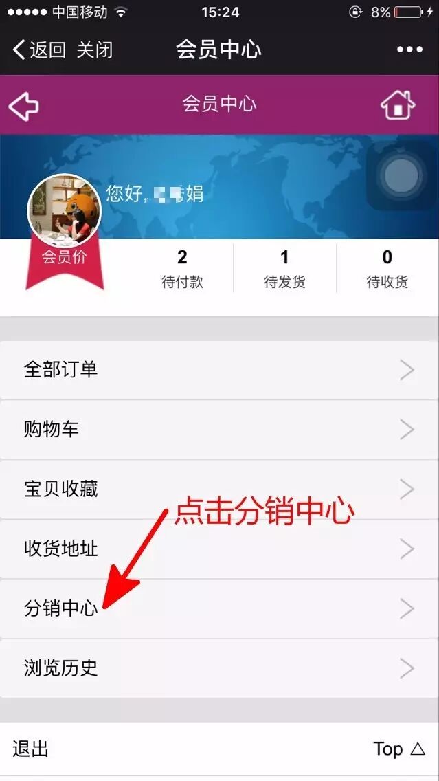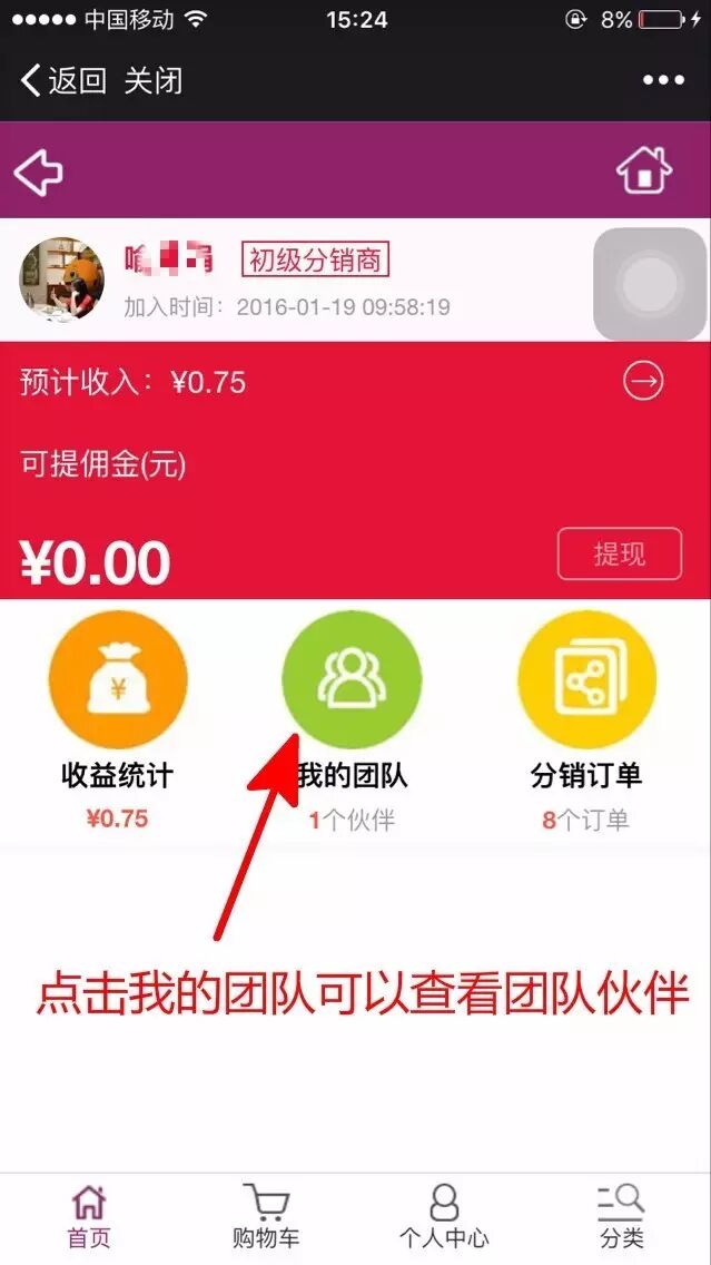 b、点击分销中心就可查看个人佣金