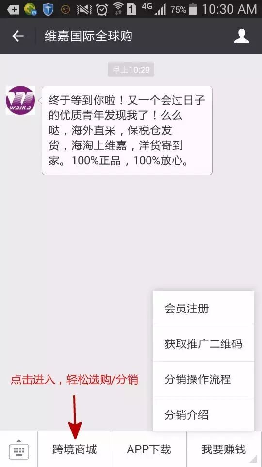2、关注维嘉国际全球购公众号,即可成为分销商;