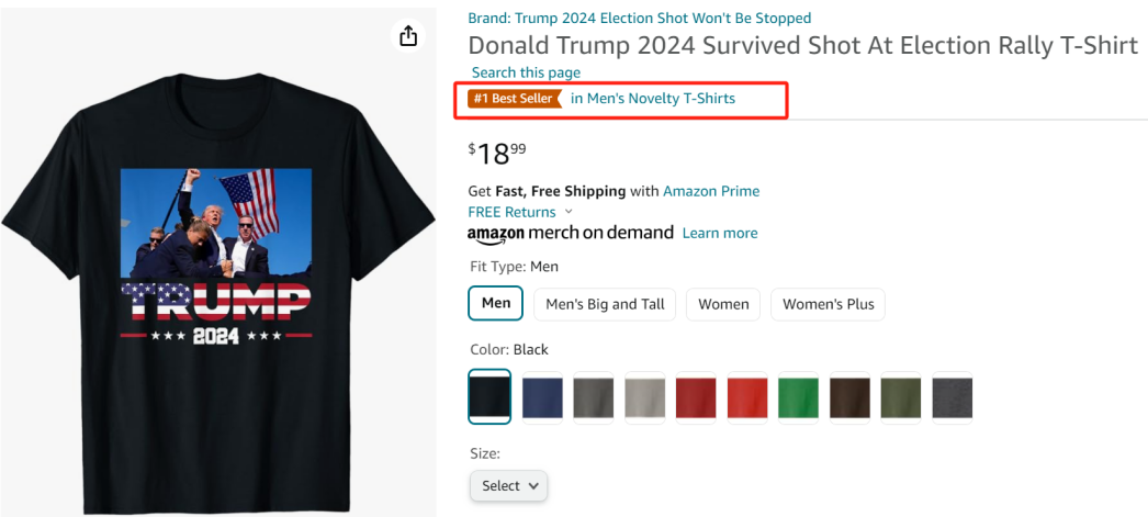 这本应该只是一个热门新闻事件,但善于抓住商机的卖家们,将“特朗普枪击现场照”设计成T恤,然后挂在了亚马逊和独立站上售卖。这件印着特朗普的T恤,迅速蹿红,直接飙升至亚马逊细分类目的榜首,简直是送上门的爆品!