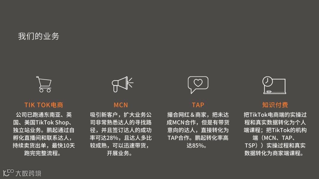 鹏起文化传媒有限公司是一家新生代互联网企业,拥有资深媒体人和创意新媒体核心,拥有成熟的互联网知识付费体系玩法和结果。借助内容和互联网的双重优势,致力于在TIKTOK平台做电商运营、MCN短视频孵化、知识付费、TAP、TSP代运营等业务。