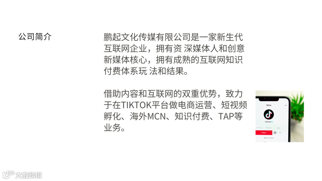 鹏起文化传媒有限公司是一家新生代互联网企业,拥有资深媒体人和创意新媒体核心,拥有成熟的互联网知识付费体系玩法和结果。我们致力于在TIKTOK平台做电商运营、短视频孵化、海外MCN、知识付费、TAP、TSP代运营等业务。