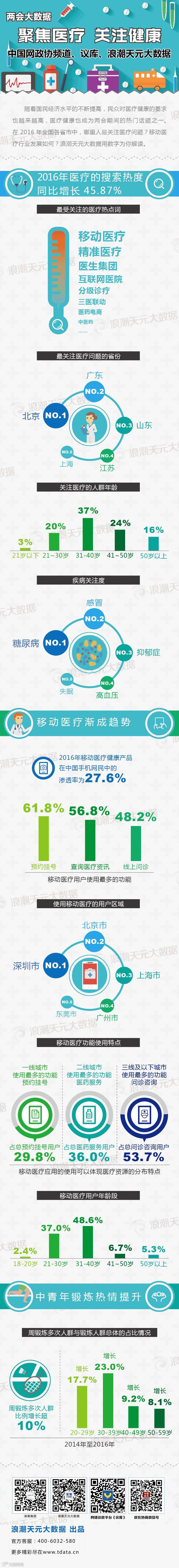 据浪潮天元大数据分析显示,截至2016年底,医疗的搜索热度同比增长45.87%。从地域来看,最关注医疗问题的省份是北京,其次是广东、山东、江苏和上海。
