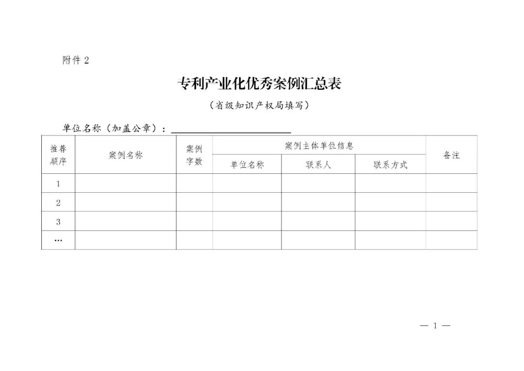 (二)请各省级知识产权局于2024年3月1日前,将案例汇总表(电子版和加盖公章后的PDF扫描件,见附件2)和全部案例文件(电子版)汇总在一个压缩包内发送至联系邮箱:zLzL@cnipa.gov.cn,邮件标题和压缩包按照“专利产业化优秀案例报送(地名)”命名。