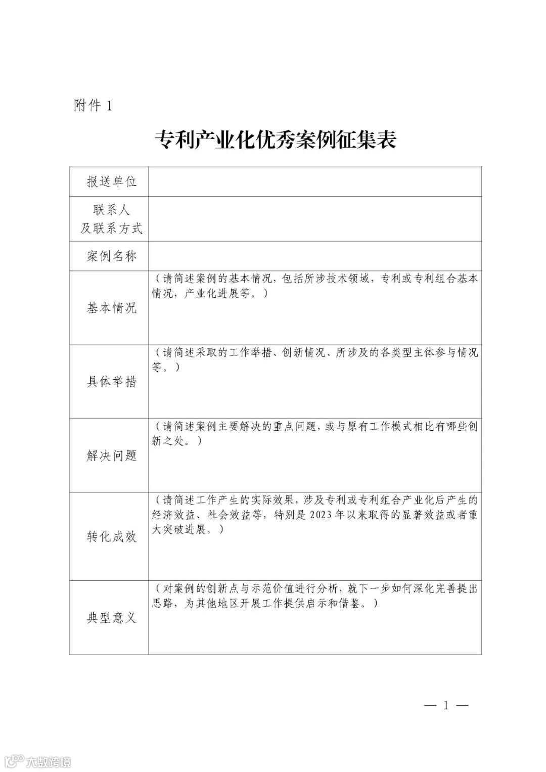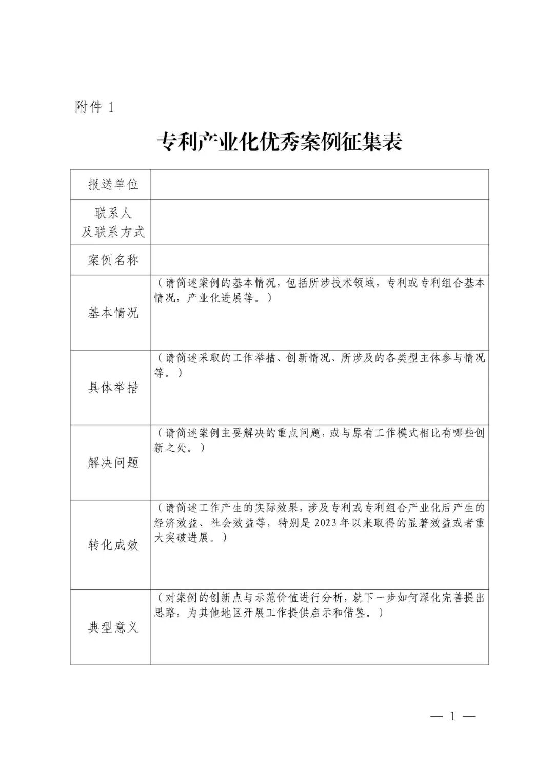 为深入推进落实国务院办公厅印发的《专利转化运用专项行动方案(2023—2025年)》,及时总结推广各地区开展专利产业化的有效做法和典型经验,在全社会营造有利于专利转化运用的良好氛围,现面向各地方开展专利产业化优秀案例征集遴选工作,有关事项通知如下: