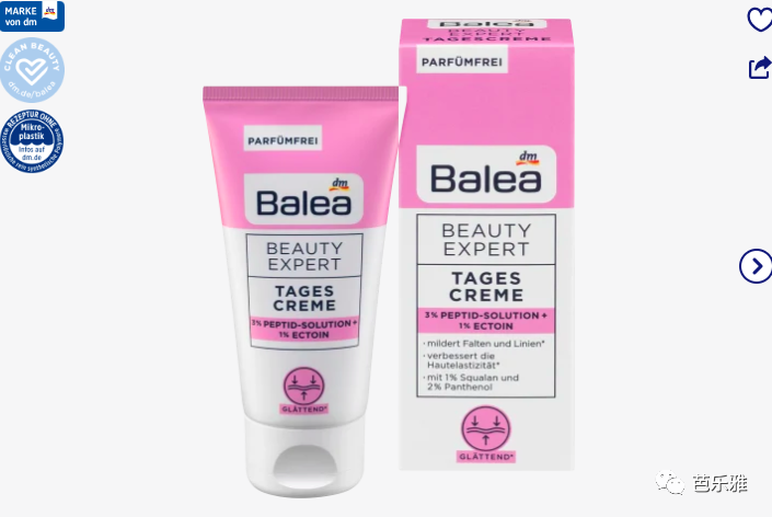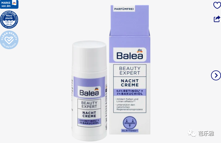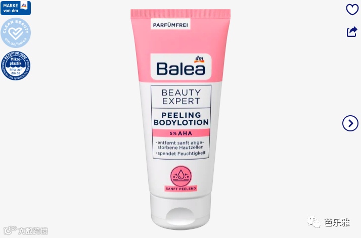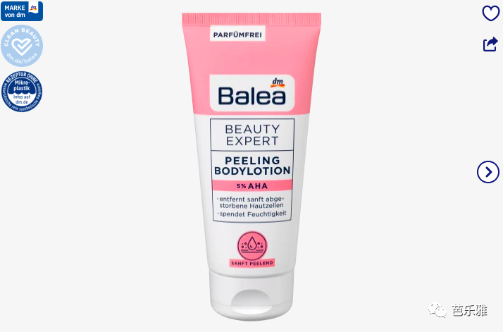 含有 5% AHA 的 Balea Beauty Expert 去角质润肤露可轻柔地去除死皮细胞。含有乙醇酸和 AHA 复合物的无香料配方为皮肤提供额外的水分,并确保肤色更细腻光滑。经常使用,皮肤感觉明显更柔软、更光滑。
