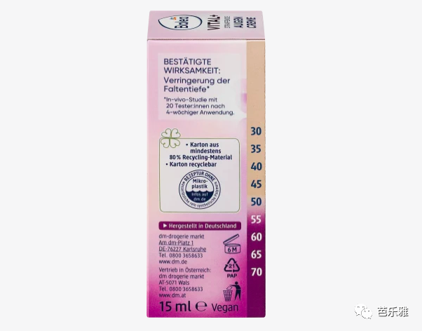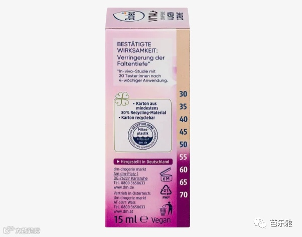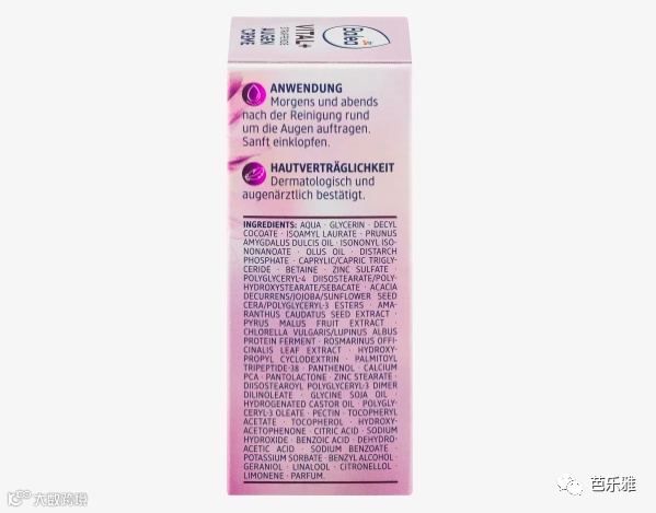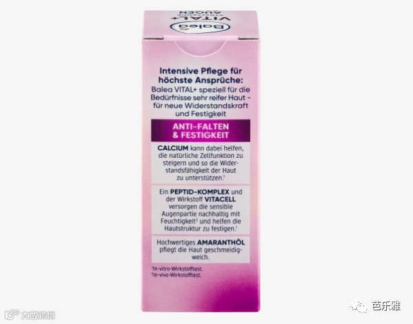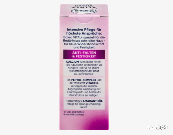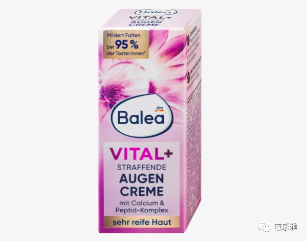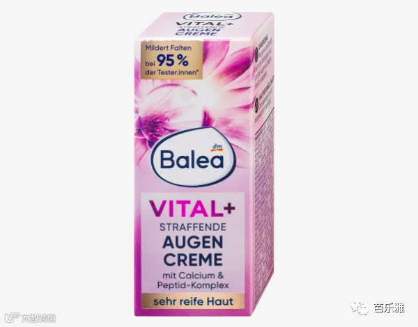 明显的弹性,新的弹性:Balea VITAL+ 紧致眼部护理呵护并强化您脆弱的眼部区域。钙增加了自然细胞功能——你的皮肤变得更有抵抗力。肽复合物和活性成分 VitaCell 为敏感的眼部区域提供持久的水分并增强皮肤结构。高品质苋菜油可保持皮肤柔软。