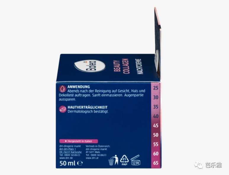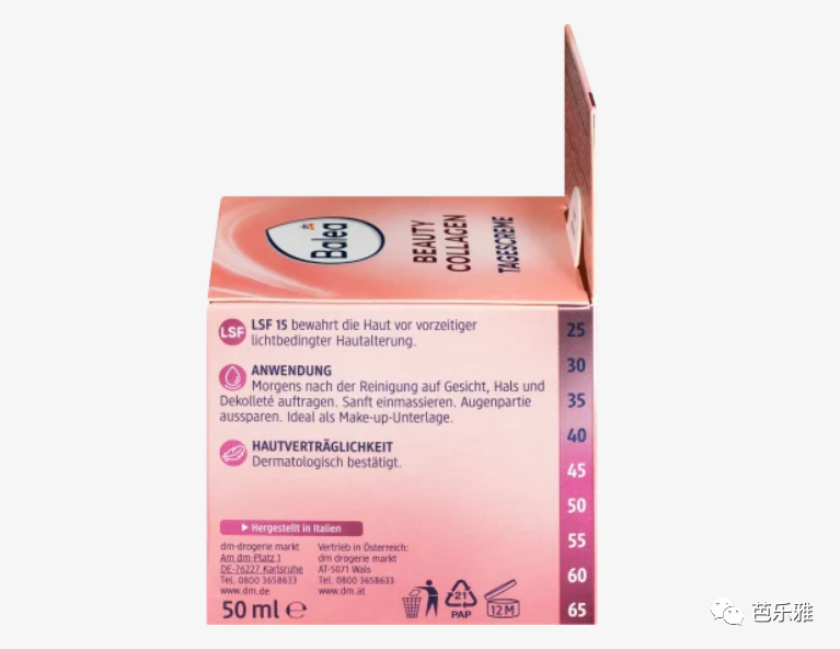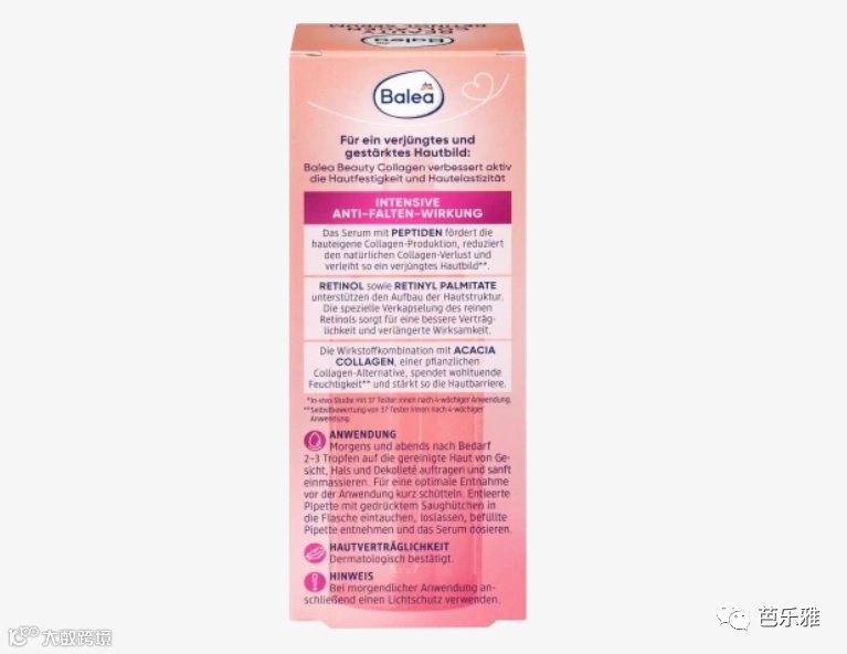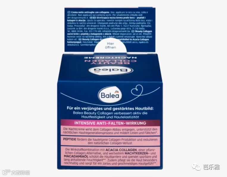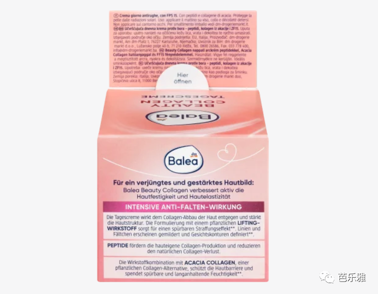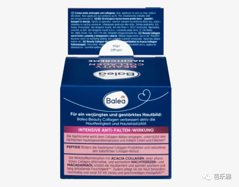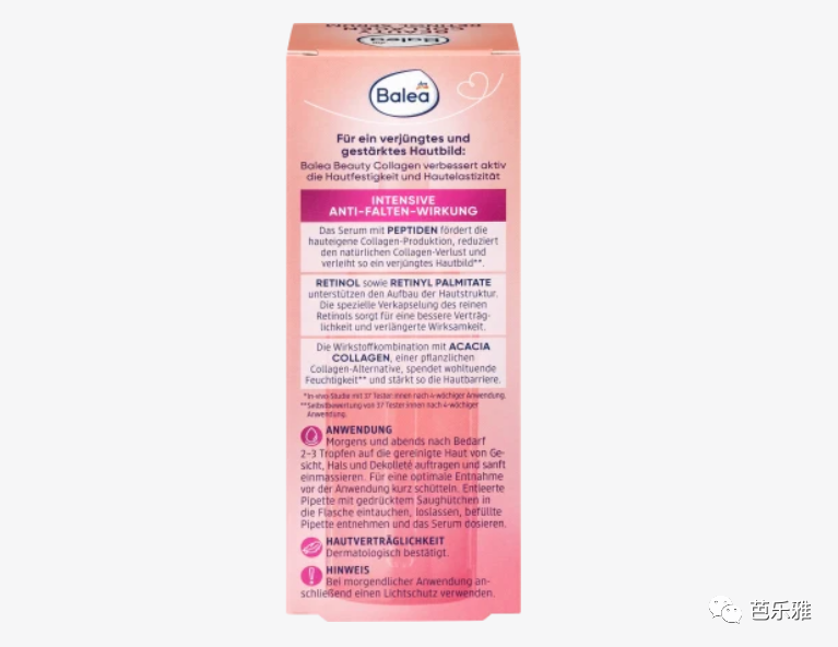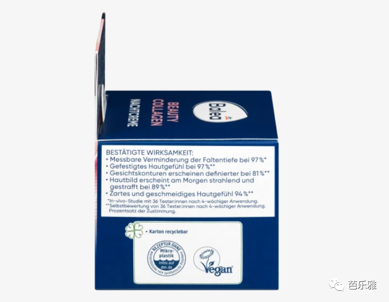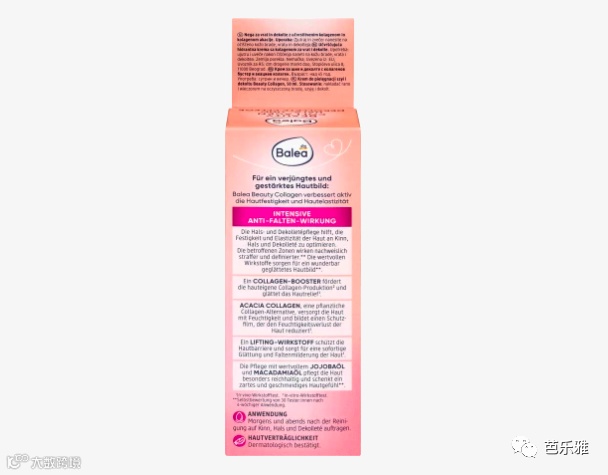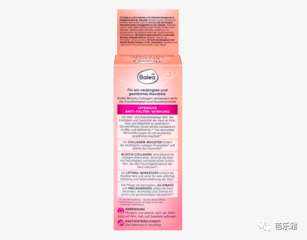 早晚洁面后,将 Balea Beauty Collagen 颈部和肩部护理涂抹于下巴、颈部和肩部。原料