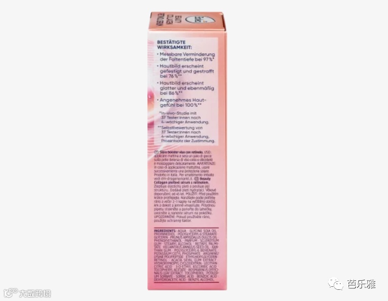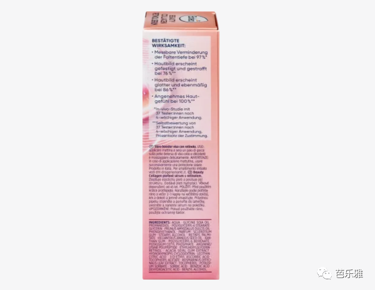 含有 PEPTIDES 的精华液可促进皮肤自身胶原蛋白的生成,减少胶原蛋白的自然流失,从而使肤色焕发活力**。视黄醇和视黄醇棕榈酸酯支持皮肤结构。纯视黄醇的特殊封装确保了更好的耐受性和更长的有效性。活性成分与植物性胶原蛋白替代品 ACACIA COLLAGEN 相结合,可提供舒缓的水分**,从而增强皮肤屏障。