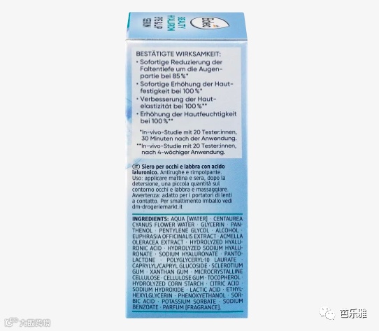 水 ,Centaurea Cyanus花水,甘油,泛醇,戊二醇,酒精,euphrasia officinalis提取物,阿卡莫拉橄榄石提取物,水解透明质酸,水解水解钠钠硫酸钠,透明质酸硫酸钠/硫酸硫酸硫酸甲酯,甲状腺磷酸甘油酸酯,帽基甘油酸酯,依赖二甘油酸酯,依赖二甘油酸酯依克莱克林依赖氏酶。-1 菌核胶、黄原胶、微晶纤维素、纤维素胶、生育酚、水解玉米淀粉、柠檬酸、氢氧化钠、乳酸、乙基己基甘油、苯氧乙醇、山梨酸、山梨酸钾、过苯甲甲酸钠、过苯甲甲酸钠