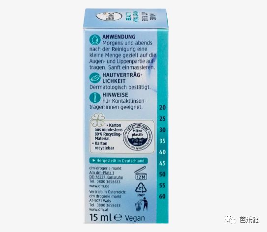 产品特性: 不含酒精、不含染料、不含纳米颗粒、不含对羟基苯甲酸酯、不含石蜡/矿物油、素食主义者