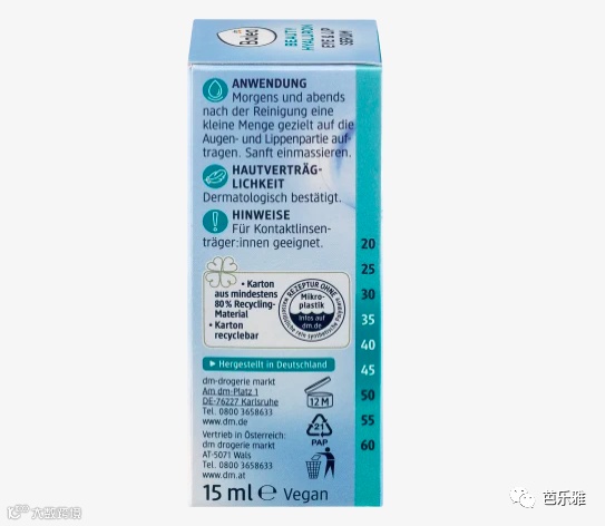 早晚洁面后,取少量 Eye & Lip Serum 涂抹于眼部和唇部。轻轻按摩。经皮肤病学批准的皮肤相容性。适合隐形眼镜佩戴者:内侧。