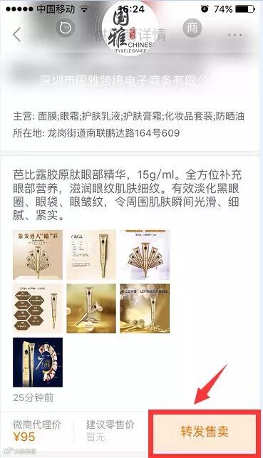 步骤二:在商家动态选择产品,点击转发售卖: