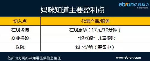 据妈咪知道方面介绍,其盈利模式将基于三个点建立。一是在线问诊,目前,妈咪知道的问诊包括免费问诊和在线急诊两种,其中,在线急诊采取收费形式,17元/10分钟;二是商业保险,本月月初,妈咪知道宣布上线商业保险“妈咪保”,针对出生30天的婴儿~17岁的少儿特别定制,保障25种少儿重疾,包括恶性肿瘤、急性心肌更塞、双目失明、双耳失聪等;第三就是线下诊所。